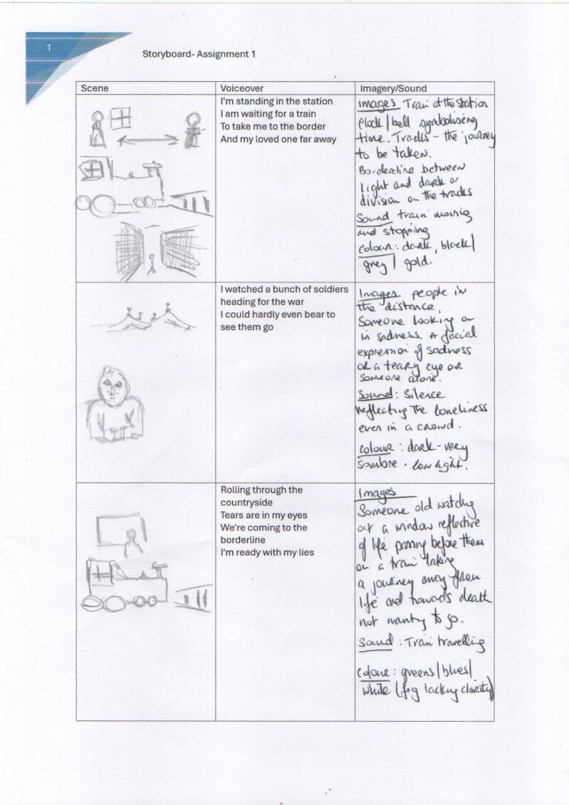 The storyboard outlines the separation and the hope of a reunion for an elderly couple. It opens with a train at the station a visual of a bell and clock setting the mood of departute. As the man stands at the border his partner is in the distance ...waiting. As he travels on his journey he sees the others gone before him and the sadness ensues as he thinks of who he's leaving behind. His partner waits in the rain reflecting the distance growing between them. The journey starts off foggy and then gets darker as the light fades. The withered tree, candle and dandelion clock show his time is passing and the fragility of life.